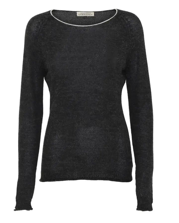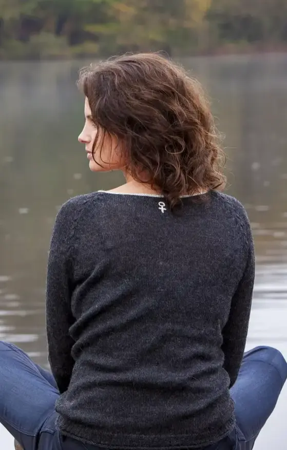 Afrodite-blusen i farven Antracit er designet af Marianne Benedicte Gorridsen og strikket i 100 % baby alpaca fra Peru. Den dybe, mørkegrå nuance får et let og levende udtryk gennem den fine hvide kant i halsudskæringen, som giver en smuk kontrast og fremhæver blusens feminine form.