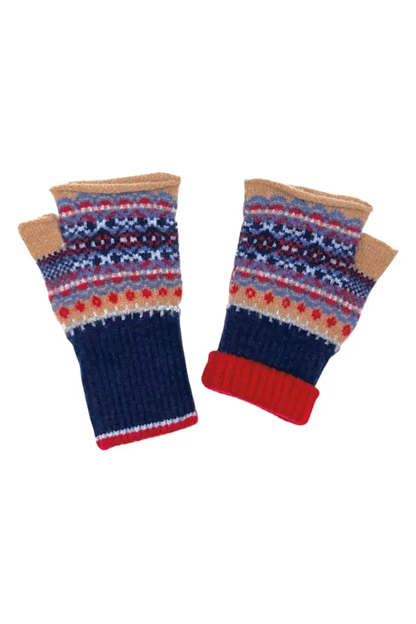 De smukke Éribe Alloa Open Mitt – Classic er et perfekt eksempel på moderne skotsk strikkekunst med historiske rødder. Strikket i 100 % blød merino lammeuld og dekoreret med Éribes karakteristiske Fair Isle-mønster i blå, beige, rød og marine – en farvekombination, der balancerer tradition og nutid på elegant vis.
