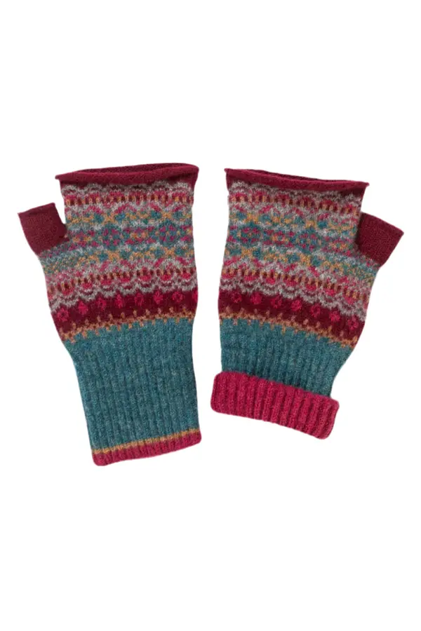 Éribe Alloa Open Mitt i farven Velvet forener varme, elegance og klassisk britisk håndværk. Mønstret kombinerer vinrød, blågrøn, rosa og gyldne nuancer i et smukt Fair Isle-design, der giver et blødt og sofistikeret udtryk.