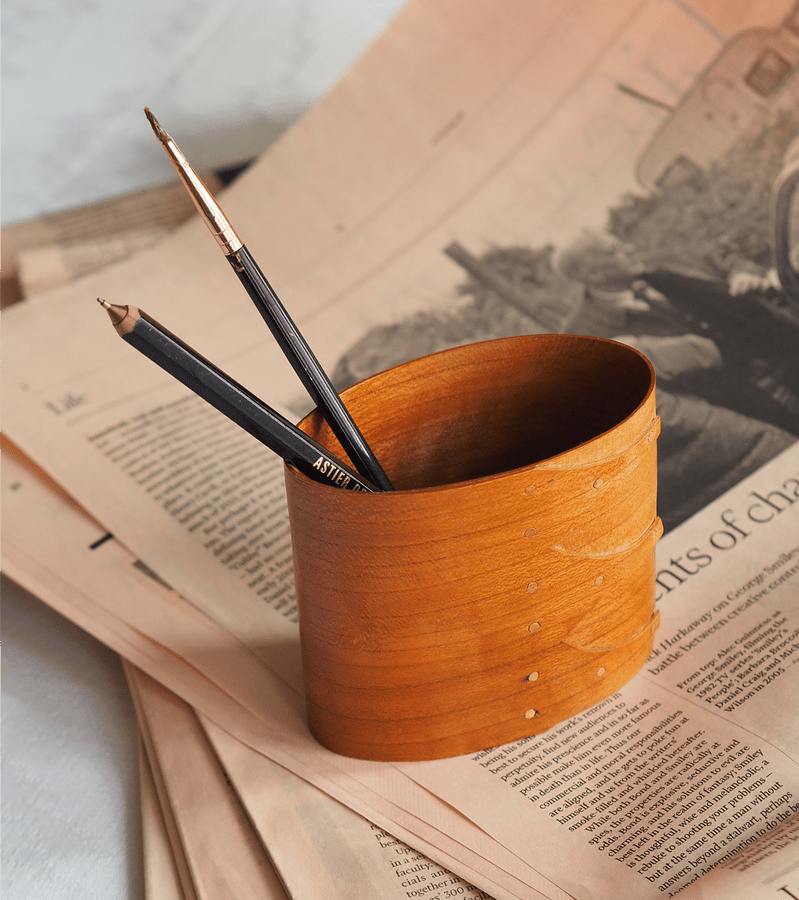 En enkel og funktionel blyantsholder designet af Rikke Falkow og fremstillet efter de klassiske shakerprincipper. Holderen er udført i massivt kirsebærtræ, hvor træets varme glød og naturlige struktur giver et tidløst udtryk.