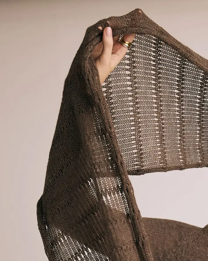 Kraka Scarf i farven Dark Camel har et klassisk hulmønster og en fin bølget kant, som giver et naturligt og varmt udtryk.