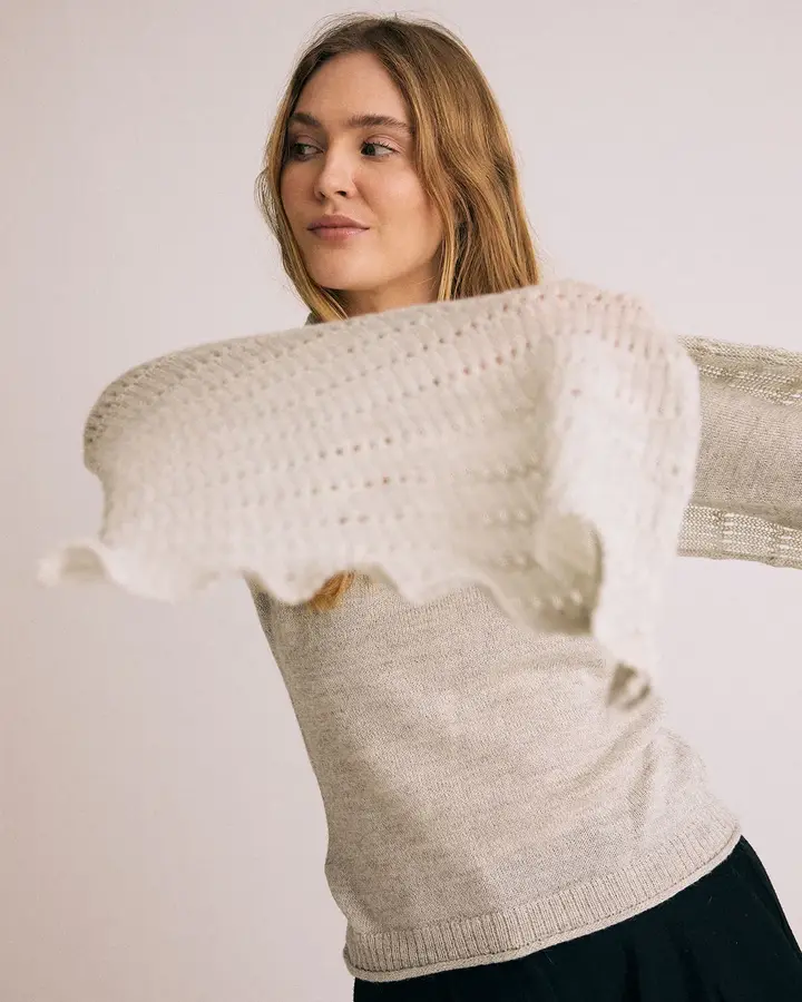 Kraka Scarf i farven Iceland har en lys, ren tone, der fremhæver det fine hulmønster og den lille bølgekant i enderne.