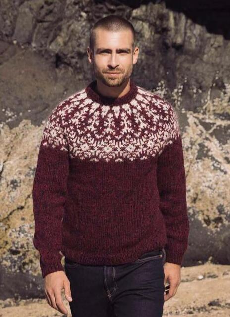 Denne sweater er strikket i Plötulopi (pladegarn) og Einband (spindegarn), begge 100% islandsk uld.