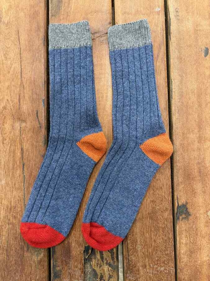 Flerefarvede blå merinostrømper med rød, grå og orange detaljer, der giver et flot farvespil.