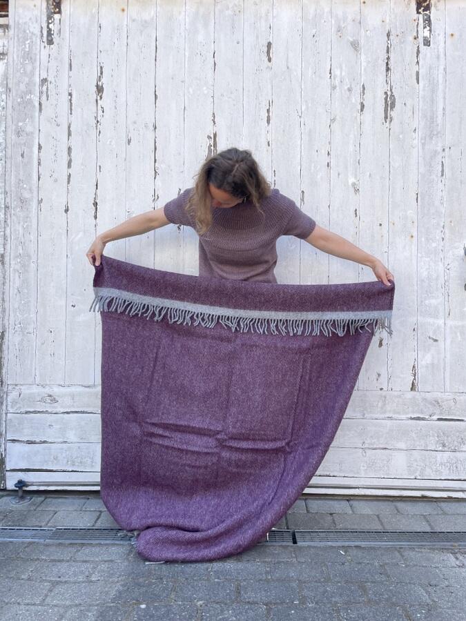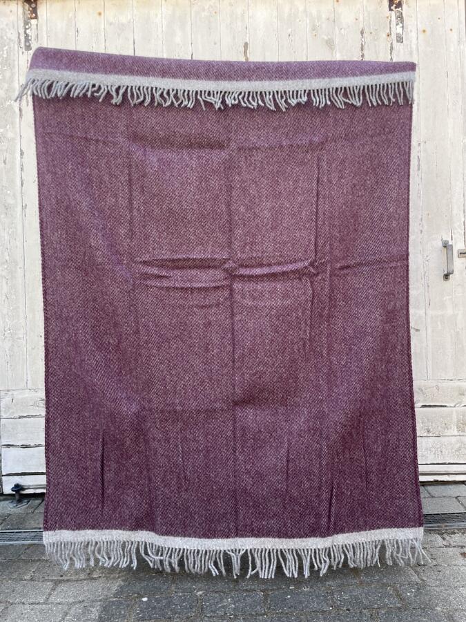 Bærfarvet meleret – Uldplaid i støvet vinlilla med grå frynser – 100% ny norsk uld